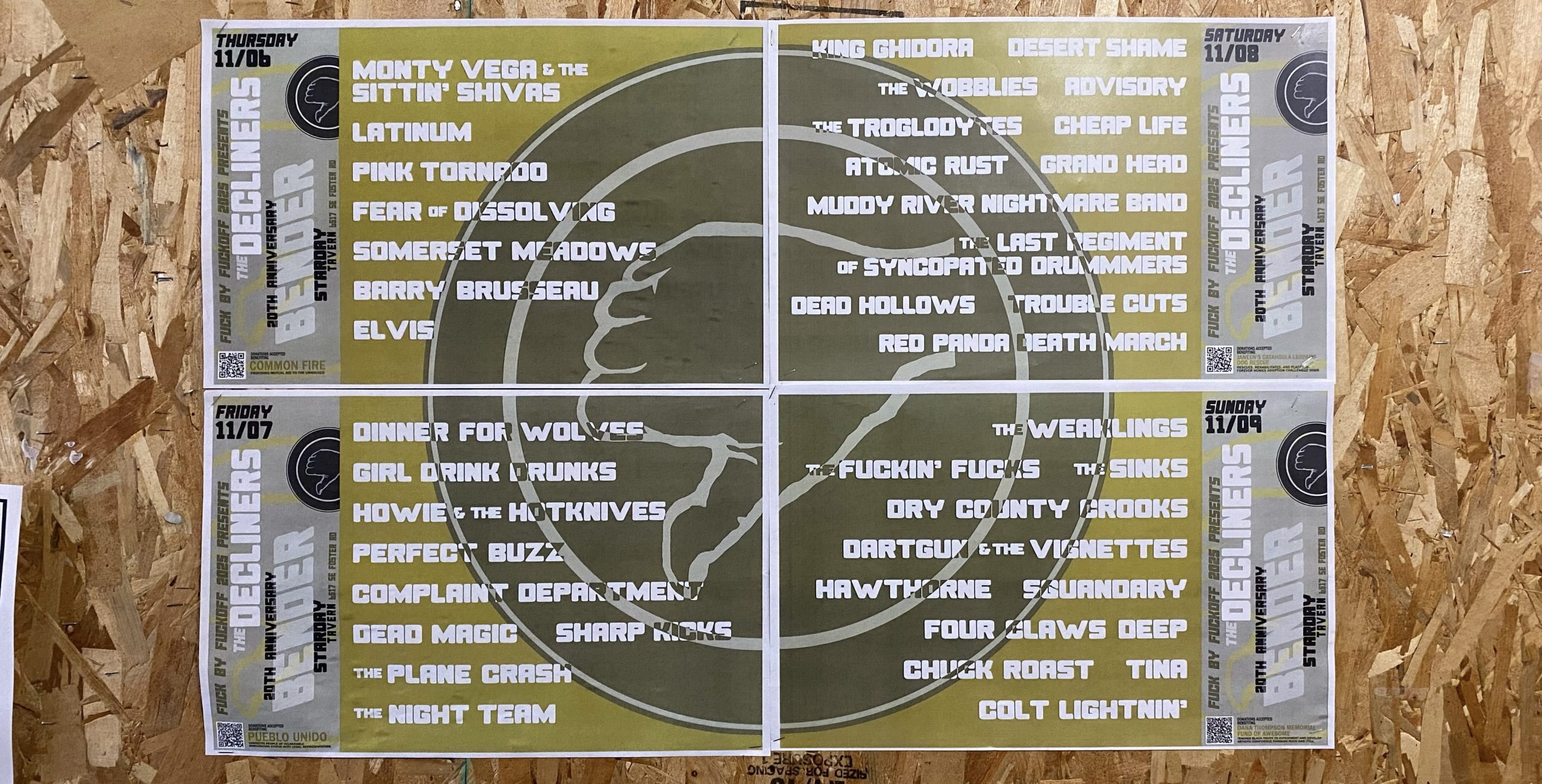 Celebrating 20 years of our old pals, The Decliners! Shows starts at 2pm w/ Colt Lightnin’, The Hickmans, Four Claws Deep, Squandary, Dartgun and the Vignettes, TINA, The Dry County Crooks, The Sinks, Hawthorne, The Decliners, The Fuckin’ Fucks, and The Weaklings! DCC is on at 6:30pm sharp!